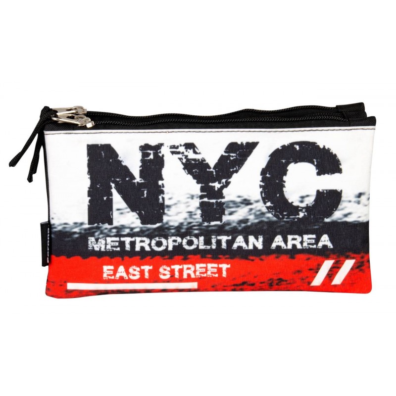 Enthält: 1 Federmäppchen in Schwarz, Weiß und Rot mit NYC-Design, drei durch Reißverschlüsse getrennte Fächer, Schiebegriff und Innenfutter.