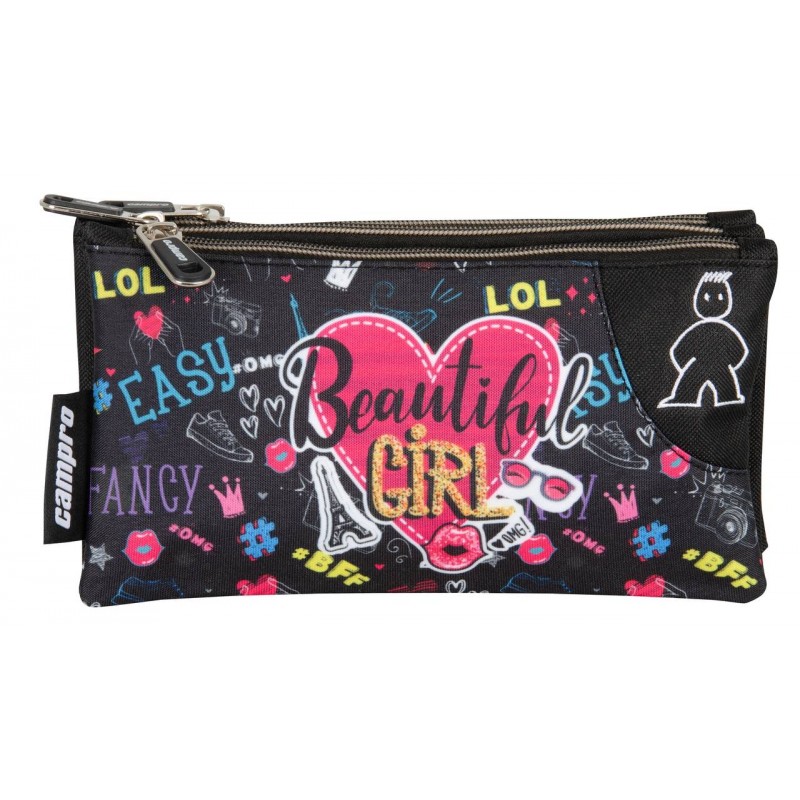 Enthält: 1 dreifaches schwarzes Federmäppchen für die Schule mit einem schönen Mädchen-Design mit Herz und weiteren Farbdetails, einem gestickten Logo, drei separaten Fächern mit Reißverschluss, einem Schiebegriff und einem schützenden Innenfutter.