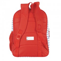 Lieferumfang: 1 weiß-blau gestreifter Kinderrucksack mit roten Details und speziell geprägtem Mickey-Mouse-Design, zwei Hauptfächer mit Reißverschluss, Innenfutter, seitliche Mesh-Flaschentasche, gepolsterte, verstellbare und atmungsaktive Schultergurte, gepolstertes Rückenteil, Handgriff Top und Personalausweis.
