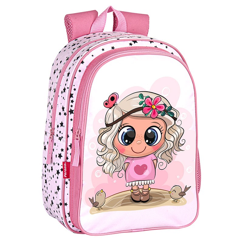 Lieferumfang: 1 rosa-weißer Kinderrucksack mit besonderem Sternenmuster an den Seiten und einer großen Puppe mit großen Augen auf der Vorderseite, großes Hauptfach mit Reißverschluss, Innenfutter, seitliche Netztasche für Flaschenhalter, gepolsterte Schultergurte mit verstellbarer Größe und atmungsaktivem Design, gepolsterter Rückseite, Griff oben und persönlichem Ausweis.
